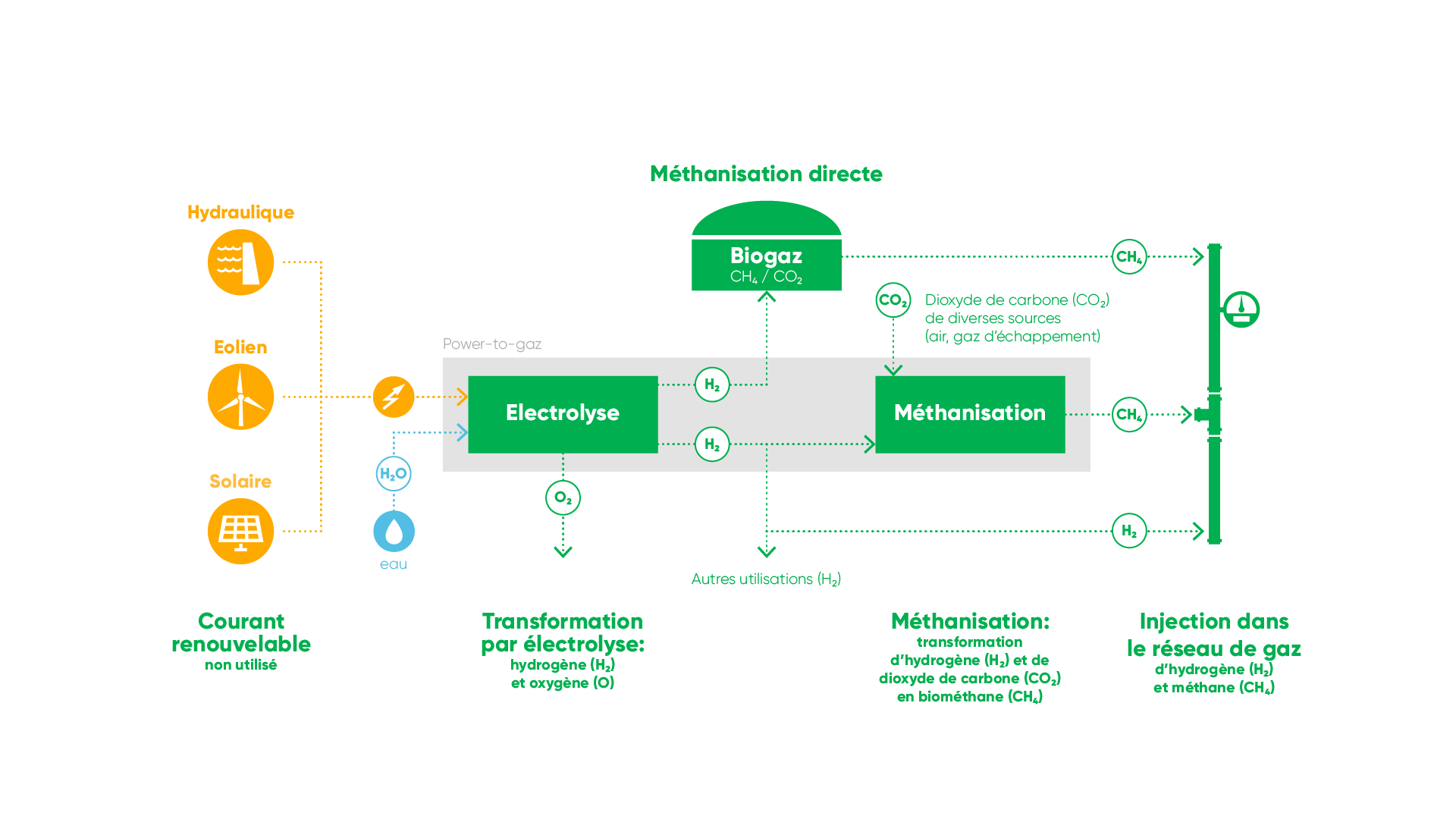 Dans une première phase, du courant issu de l’énergie éolienne, solaire, hydroélectrique ou de la géothermie est transformé en hydrogène, qui est à son tour converti en méthane synthétique présentant les mêmes qualités que le gaz naturel, moyennant adjonction de CO2. Les applications sont innombrables: